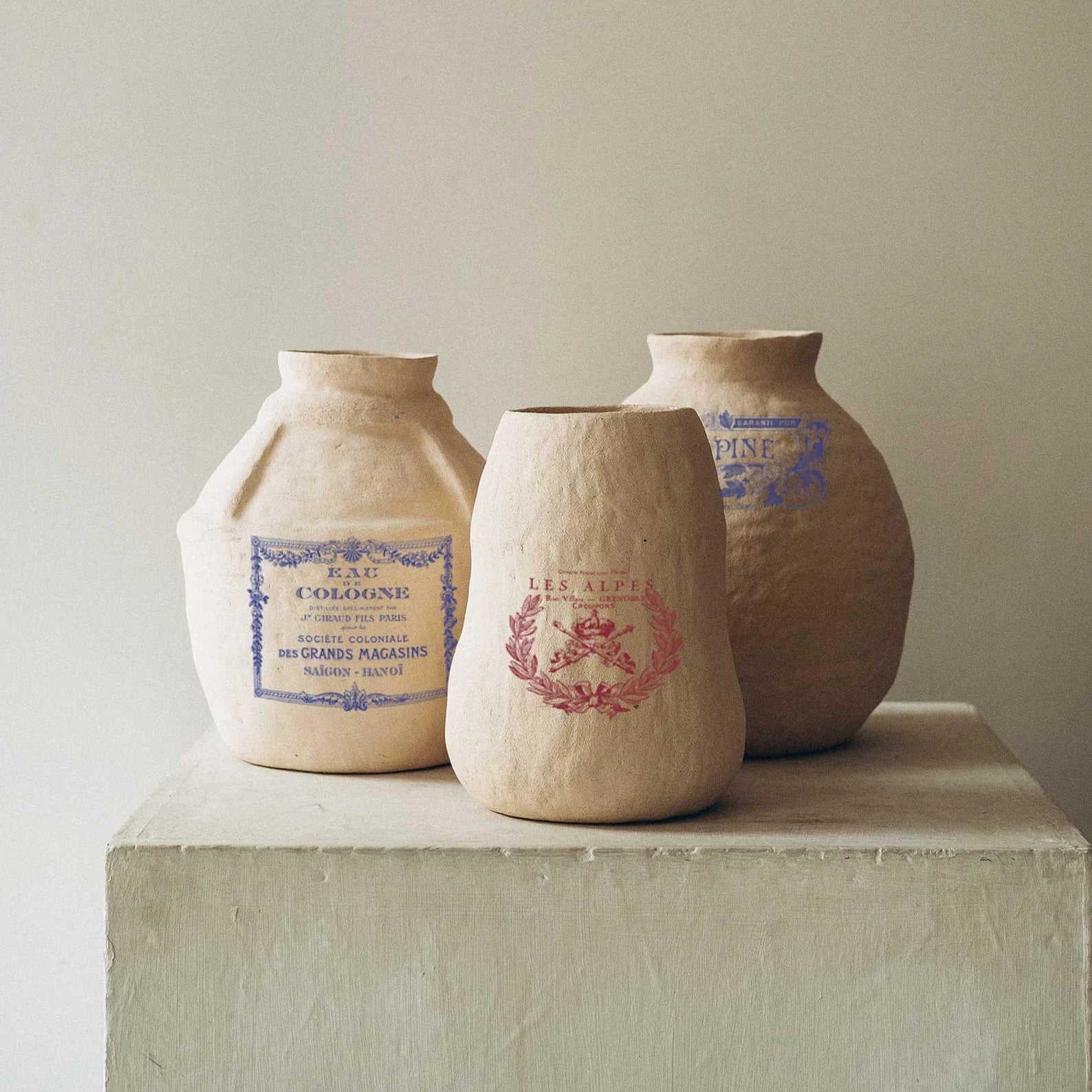 Motivet består av klassiske etiketter og rammer i ulike former og størrelser, inspirert av vintage apotek, gamle krukker og håndskrevne merkelapper. Uttrykket gir et autentisk, gammeldags preg.