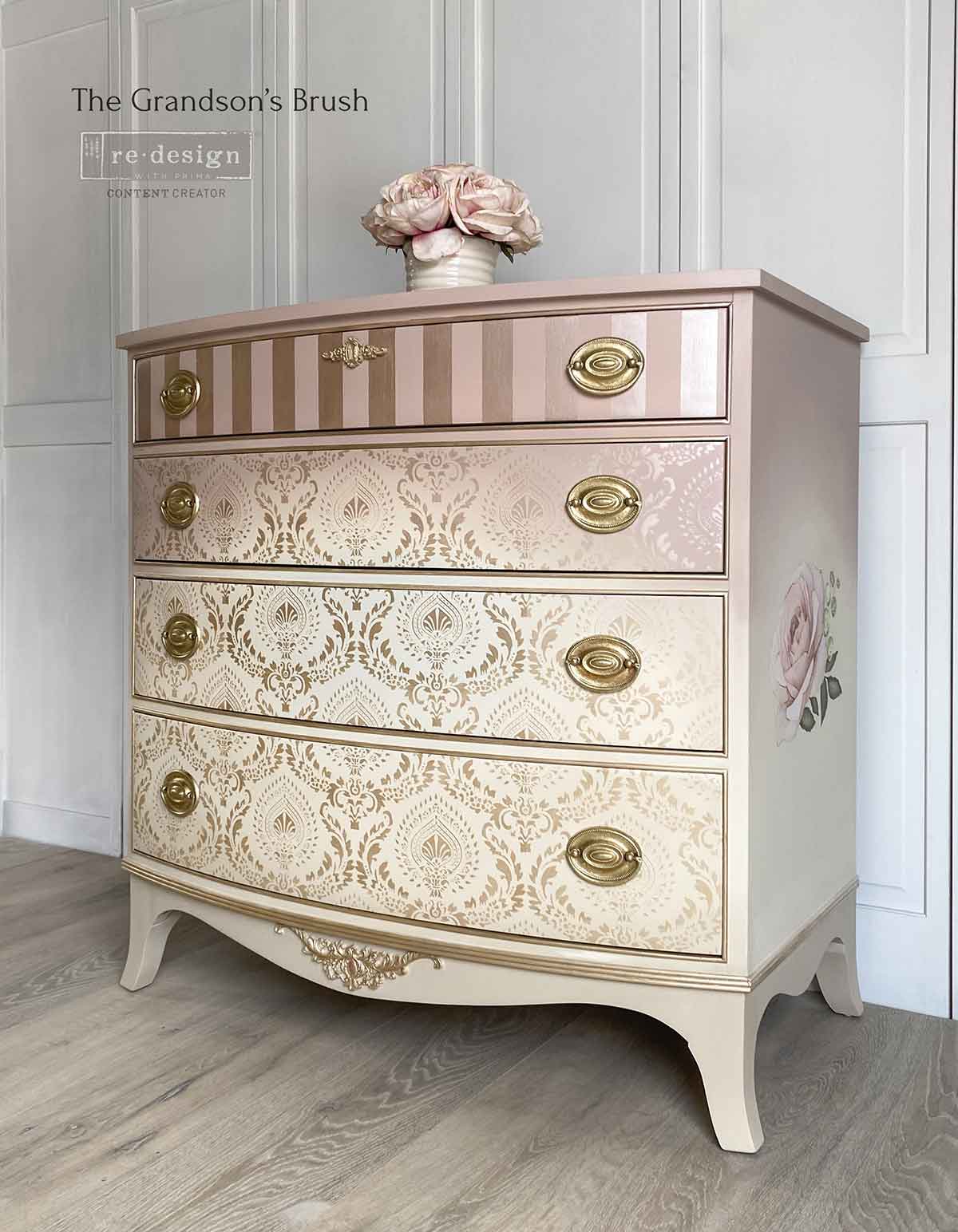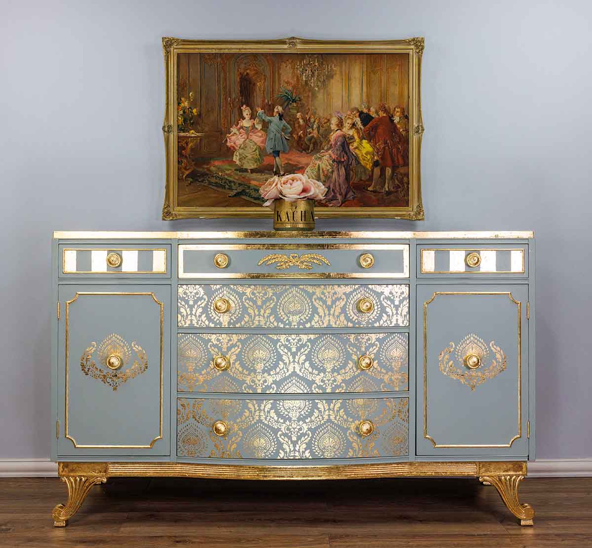 Kachas Versailles-inspirerte kolleksjon vil gi et glamorøst og vintage preg til møbler og vegger med denne fantastiske damask-sjablongen, Anisa