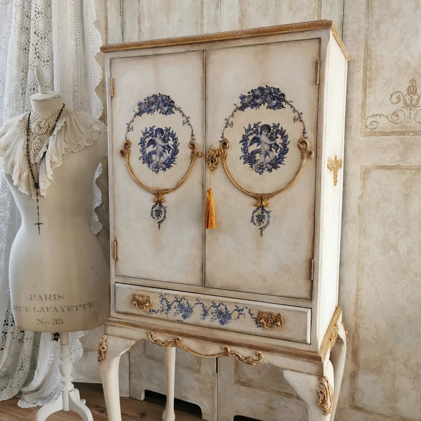 Nostalgiske motiver i blått, med engel, ornamenter og blomster i fransk vintage stil 💙