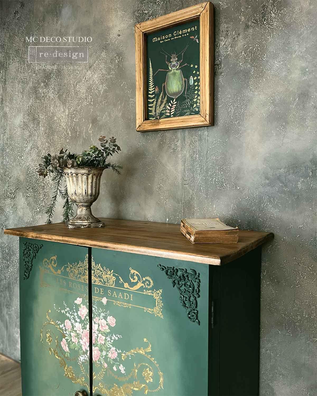 Kacha sin kjærlighet for gylne detaljer og vakre blomster uttrykkes perfekt i hennes nye Décor Transfer, “Les Roses”. Romantisk fransk skrift slynger seg vakkert sammen med friske rosa roser og moderne gull-detaljer.