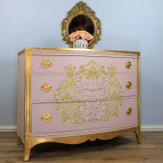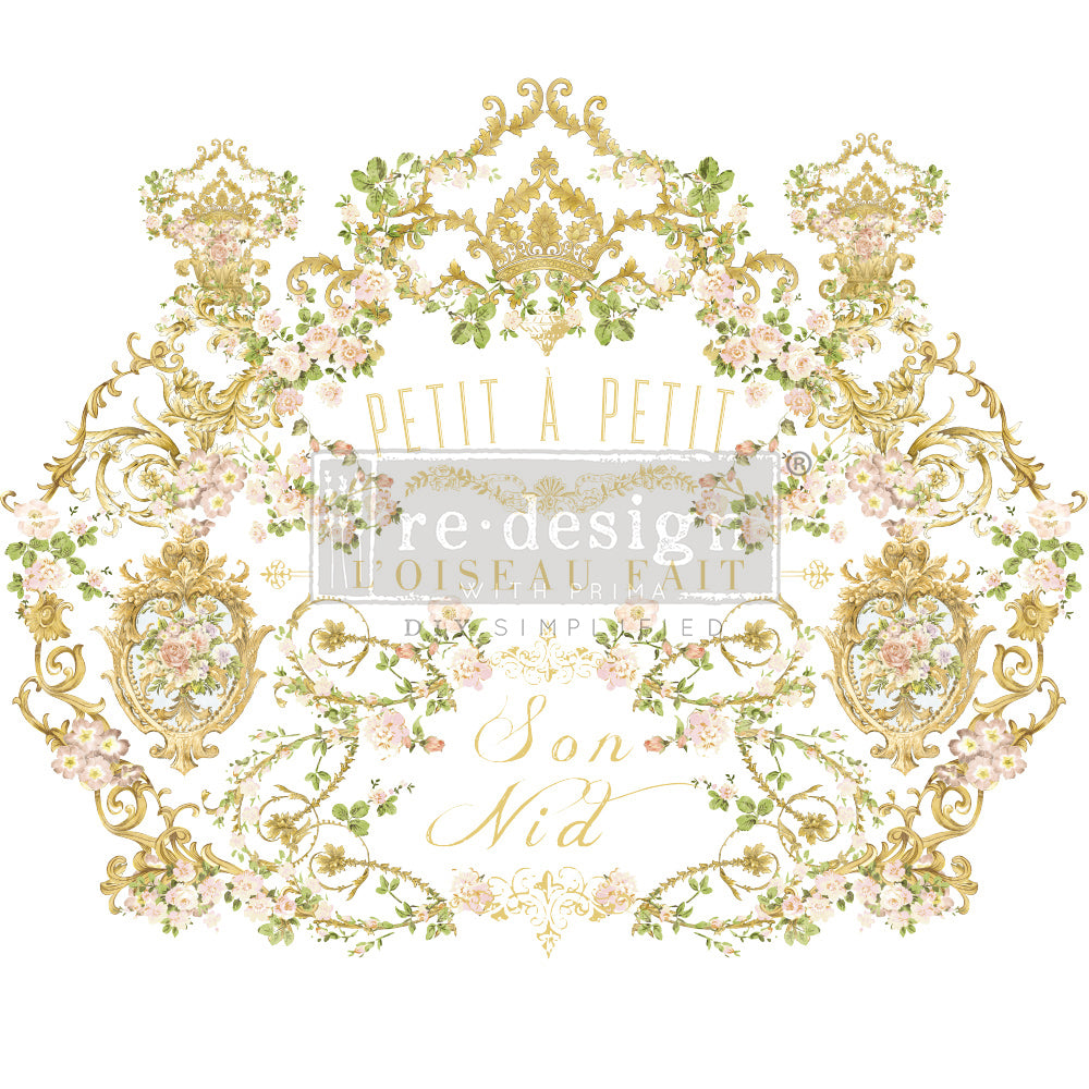 Med et nydelig fransk ordtak som oversettes til «Litt etter litt bygger fuglen sitt rede», er dette vakre transferet med skinnende gull, myk rosa og frisk grønn inspirert av tapetet i Marie Antoinettes soverom i Versailles! Nesten hvilken som helst farge fungerer som base under dette metalliske gulltransferet – det tilfører glam til prosjektet ditt og er svært allsidig 💫